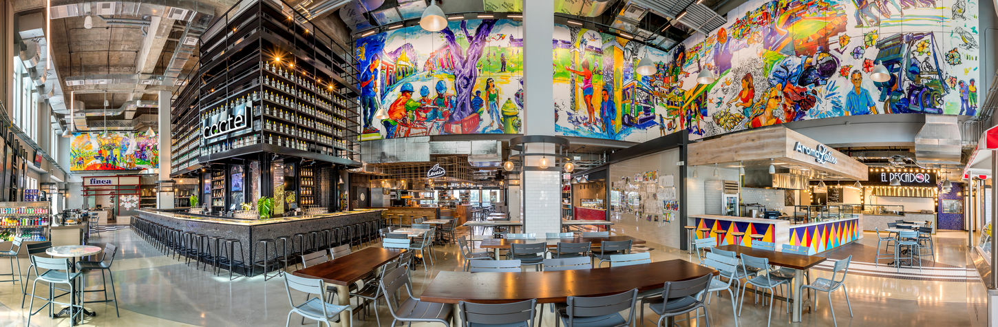 Located near the Caribe Hilton, one of the first Caribbean Resorts, in San Juan, Puerto Rico, the Mercado de Paseo Caribe boasts 14 different local food and beverage tenant concepts and seating for over 300. Created as part of the Paseo Caribe development by the developer Caribbean Property Group LLC (CPG), El Mercado was conceived to bring the excitement and flare of Puerto Rican cuisine and culture to the new development. Anchoring the lofty 50’ tall central space is the main bar concept, featuring a multistory back bar which serves as the central organizing hub for the overall floor plan from which the other vendor spaces and seating areas radiate around. The soaring double high space is rung by locally created murals overseen by New York muralist Tom Christopher.
